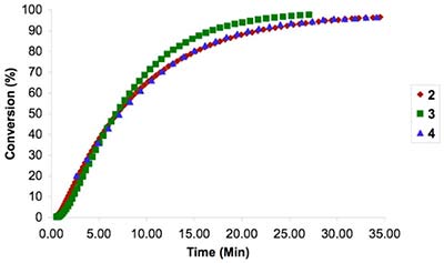 活性炭在CH 2 Cl 2中的活性與其他催化劑在二烯丙基二乙酸二乙酯的RCM反應(yīng)中進行比較(5)。如圖2所示,PEG鏈與N-雜環(huán)碳烯(NHC)的連接不會顯著影響活性炭的活性。