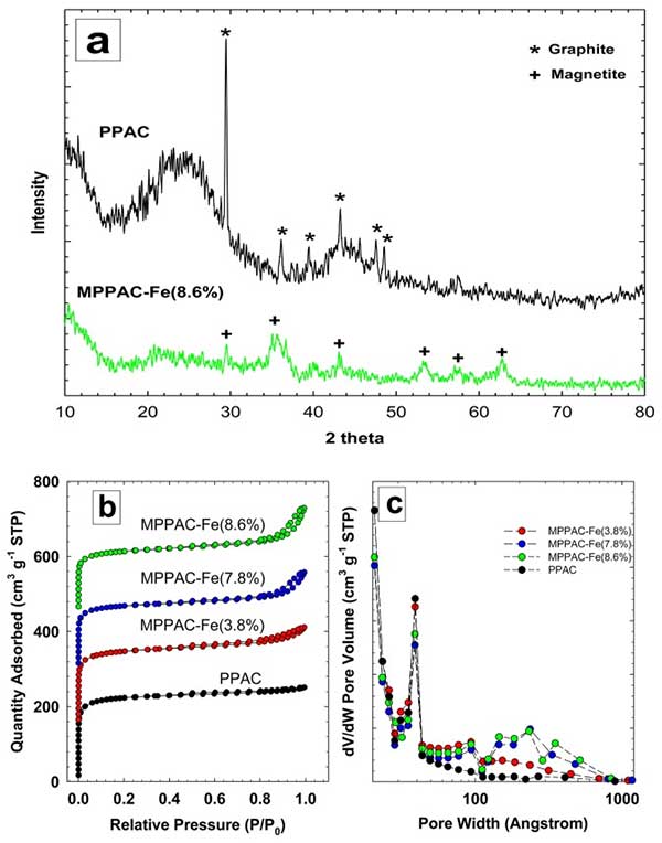圖:2(a)活性炭和磁化活性炭-Fe的XRD圖譜(8.6%),(b)N 2氣吸附-解吸等溫線和(c)根據(jù)方程計算的活性炭孔隙寬度的微分孔體積,F(xiàn)AAS校正。