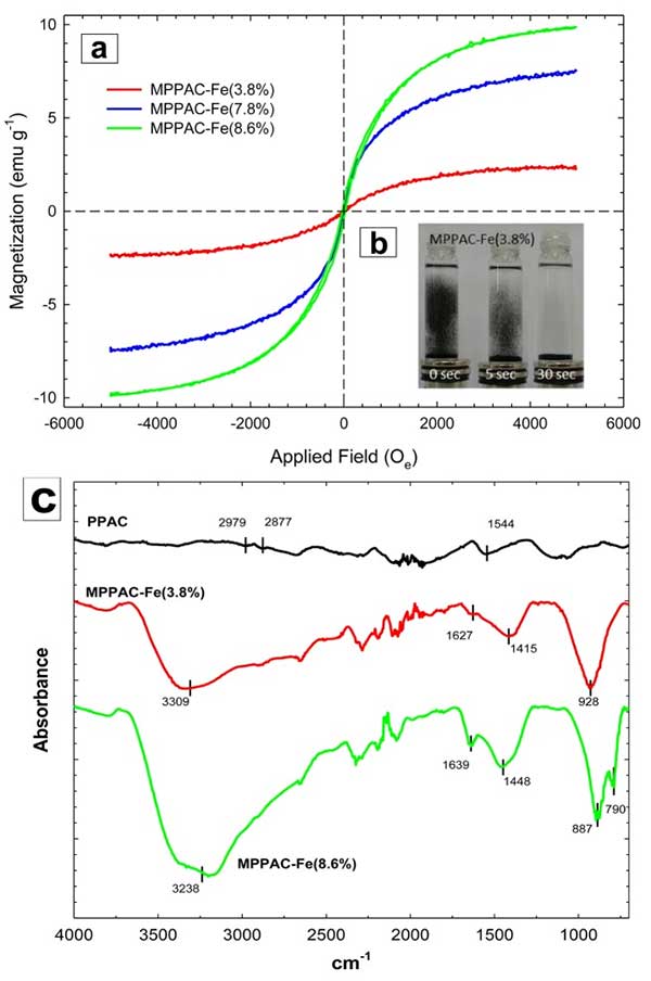 圖:3(a)所有磁化活性炭材料的磁化強度與施加的磁場之間的關系,(b)顯示了由外部磁體懸浮的磁化杏花天的沉降時間,(c)活性炭,磁化活性炭-Fe(3.8%)和-Fe(8.6%)的FTIR光譜。