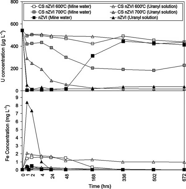 在700℃合成的活性炭記錄的最大鈾除去量低于硼氫化物還原的零價鐵。這部分歸因于Fe 0的質(zhì)量百分比較低在前者材料中。另外,鈾吸收的動力學(xué)記錄為活性炭較慢,表明鈾吸附表面位置的密度較低。盡管如此,在700℃下合成的活性炭記錄了在實驗的后期(> 7天)中較低的鈾解吸。這種差別鈾吸收行為的具體機制仍不清楚。