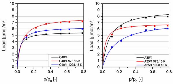 圖2顯示極性溶劑丙酮在25攝氏度的吸附等溫線。未涂覆的活性炭A35/4與活性炭C40/4相比的負(fù)載顯著較高。兩種碳都是由相同的原料制造的,但活性炭A35/4在水蒸氣氣氛中經(jīng)過(guò)較長(zhǎng)時(shí)間的活化。由于原始生產(chǎn)過(guò)程中氧化條件下活化時(shí)間較長(zhǎng),活性炭A35/4具有較高的極性表面基團(tuán)數(shù)量,有利于極性丙酮的吸附。在700攝氏度下涂覆的樣品的負(fù)載對(duì)于兩種類型的活性炭具有相同的數(shù)量級(jí),因?yàn)橛捎趦?nèi)部孔系統(tǒng)的涂覆,表面特性的差異減小,并且表面化學(xué)的相關(guān)修改。2涂層和極性丙酮,極性活性炭A35/4上的負(fù)載僅略有變化。在820攝氏度下涂覆的樣品也具有可比較的負(fù)載。由于非極性SiC涂層和由此導(dǎo)致的較弱的相互作用,負(fù)載低于在700攝氏度下涂覆的樣品的負(fù)載。