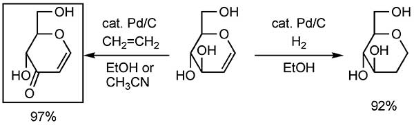醇氧化為羰基化合物是有機(jī)合成中最基本的反應(yīng)之一。我們實(shí)驗(yàn)了的Pd / C -乙烯系統(tǒng)為芐基和烯丙基醇氧化成相應(yīng)的酮。該反應(yīng)的代表性實(shí)例示于圖1中。在氫氣氛下用催化量的Pd / C在乙醇中處理D-葡糖糖得到92%收率的“正常的”氫化2-脫氧-1,5-脫水葡萄糖醇。相反,當(dāng)在乙烯氣氛下進(jìn)行相同的反應(yīng)時(shí),得到脫氫的1,5-脫水己-1-烯-3-酮,產(chǎn)率為97%。