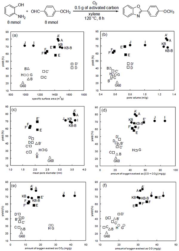 圖2顯示了活性炭的性質(zhì)與氧化芳構(gòu)化產(chǎn)率之間的關(guān)系。很明顯,化學(xué)活性炭(圖2中的實(shí)心符號(hào))比蒸汽活性炭(未填充符號(hào)○□△)具有更高的反應(yīng)性。然后,我們將注意力轉(zhuǎn)向表面氧基團(tuán),因?yàn)榛瘜W(xué)活化方法通常在比蒸汽活化方法更低的溫度下進(jìn)行,因此通過前一種方法獲得的活性炭表面上保留了更多的表面氧基團(tuán)。如在所示圖2(f)中,其演變?yōu)镃O表面氧基具有提高檢查的所有特性中的反應(yīng)產(chǎn)率的最佳趨勢。總氧量以CO和CO 2形式出現(xiàn)而作為CO 2放出的氧氣量與反應(yīng)產(chǎn)率沒有很強(qiáng)的關(guān)系[ 圖2(d),(e)]。在這里,CO將來源于苯酚,羰基和醌基團(tuán),CO 2將來自存在于原始活性炭表面上的羧基和內(nèi)酯基團(tuán)。比表面積,孔體積和平均孔徑似乎與反應(yīng)產(chǎn)率幾乎沒有關(guān)系[ 圖2(a),(b),(c)]。