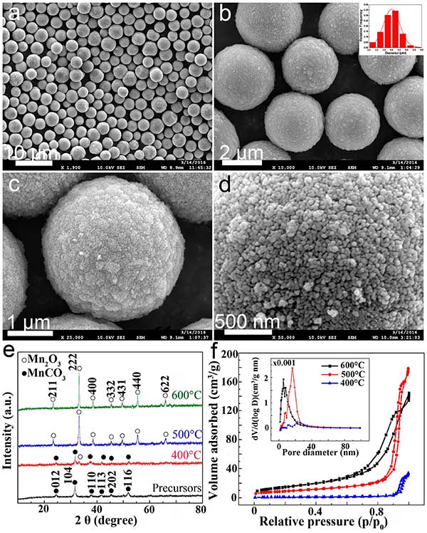 基于逐步自組裝生長(zhǎng)的方法,可以首先在甘油中制備具有良好控制的尺寸和形態(tài)的單分散的MnCO 3前體微球體,然后將其轉(zhuǎn)化為分級(jí)的多孔Mn 2 O 3通過在400,500和600℃下退火8小時(shí),大規(guī)模涂覆活性炭的微球體。我們可以通過簡(jiǎn)單地使用甘油作為溶劑合成活性炭層來裝飾Mn基電極材料,然后在較高溫度下原位碳化生物質(zhì)。根據(jù)一系列的實(shí)驗(yàn)測(cè)試發(fā)現(xiàn)這些材料的高度增強(qiáng)的電化學(xué)性能可歸因于它們的表面的活性炭涂層。
