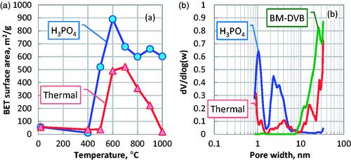 圖2.在600℃下用或不用磷酸得到的母體聚酰亞胺共聚物和活性炭的BET表面積(a)和孔徑分布(b)的溫度演變。