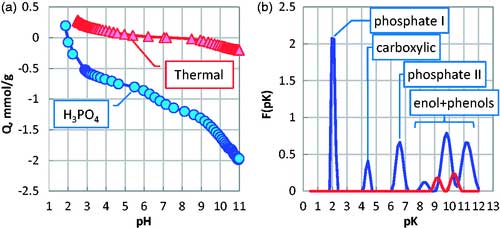 磷酸活化的活性炭有豐富表面官能團(tuán)由電位滴定法證明。質(zhì)子結(jié)合等溫線表明,無磷酸熱處理得到的活性炭在pH約為7時具有PZC中性表面,并含有非常少量的表面基團(tuán)(圖4(a))。相反,通過磷酸活化獲得的活性炭在酸性表面基團(tuán)的高濃度下在約pH 2下顯示具有PZC的酸性表??面。酸性表面基團(tuán)的計算分布顯示磷酸基團(tuán)的存在顯然源于磷酸、 羧酸基團(tuán)、磷酸酯基,烯醇和酚基的第二解離常數(shù)(圖3(b))。