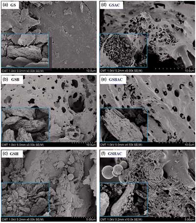 圖1顯示了合成的活性炭及其前體的形態(tài)。木質(zhì)纖維素和水熱材料孔隙度低,表面相當(dāng)粗糙。這些觀察結(jié)果與它們的低S BET和總孔體積相匹配。GSH中的微球在圖1中可見(jiàn),是由GS在熱液碳化過(guò)程中的高纖維素組分形成的。但木質(zhì)素含量高可能會(huì)阻止氫化活性炭樣品中大量碳球的形成。此外,水熱過(guò)程中纖維素和木質(zhì)素的分解較弱,可能是氫化活性炭孔隙發(fā)育不良的原因。當(dāng)木質(zhì)纖維素材料在高溫下熱解時(shí),生物活性炭的形態(tài)可以觀察到顯著的變化。生物活性炭的表面形態(tài)示出發(fā)達(dá)的孔隙和相當(dāng)高的表面積,并且因此,生物活性炭可以被認(rèn)為是一個(gè)綠色的吸附劑在廢水處理過(guò)程中使用。