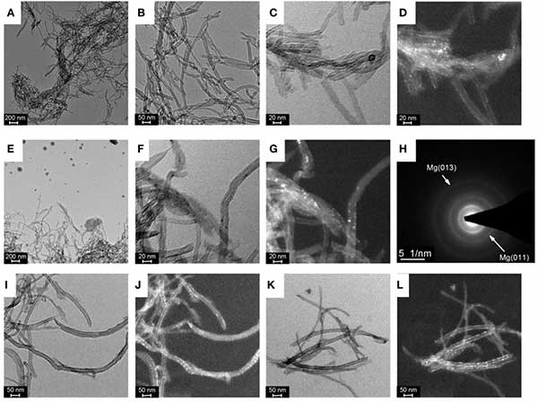 圖1。(A,B)活性炭的透射電子顯微鏡(TEM)圖像的明視野,(C)在活性炭上沉積的鎂的明場和(D)暗場TEM圖像,濃度為1mg毫升-1,(E,F(xiàn))明場和(G)的鎂的暗場TEM圖像保藏在碳納米管為2毫克ml的濃度-1,(H)中的分散體的相關(guān)聯(lián)的所選區(qū)域電子衍射(SAED)圖案活性炭(I)明場和(J)的Mg的暗場TEM圖像保存在活性炭為5毫克ml的濃度-1 (K)明場和(L)的Mg的暗場TEM圖像保存在活性炭為10mg ml的濃度-1。